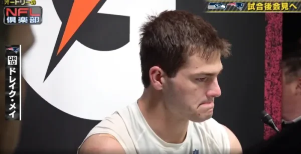 試合後の記者会見で悔しさのあまりに涙するペイトリオッツQB”ドレイク・メイ”。